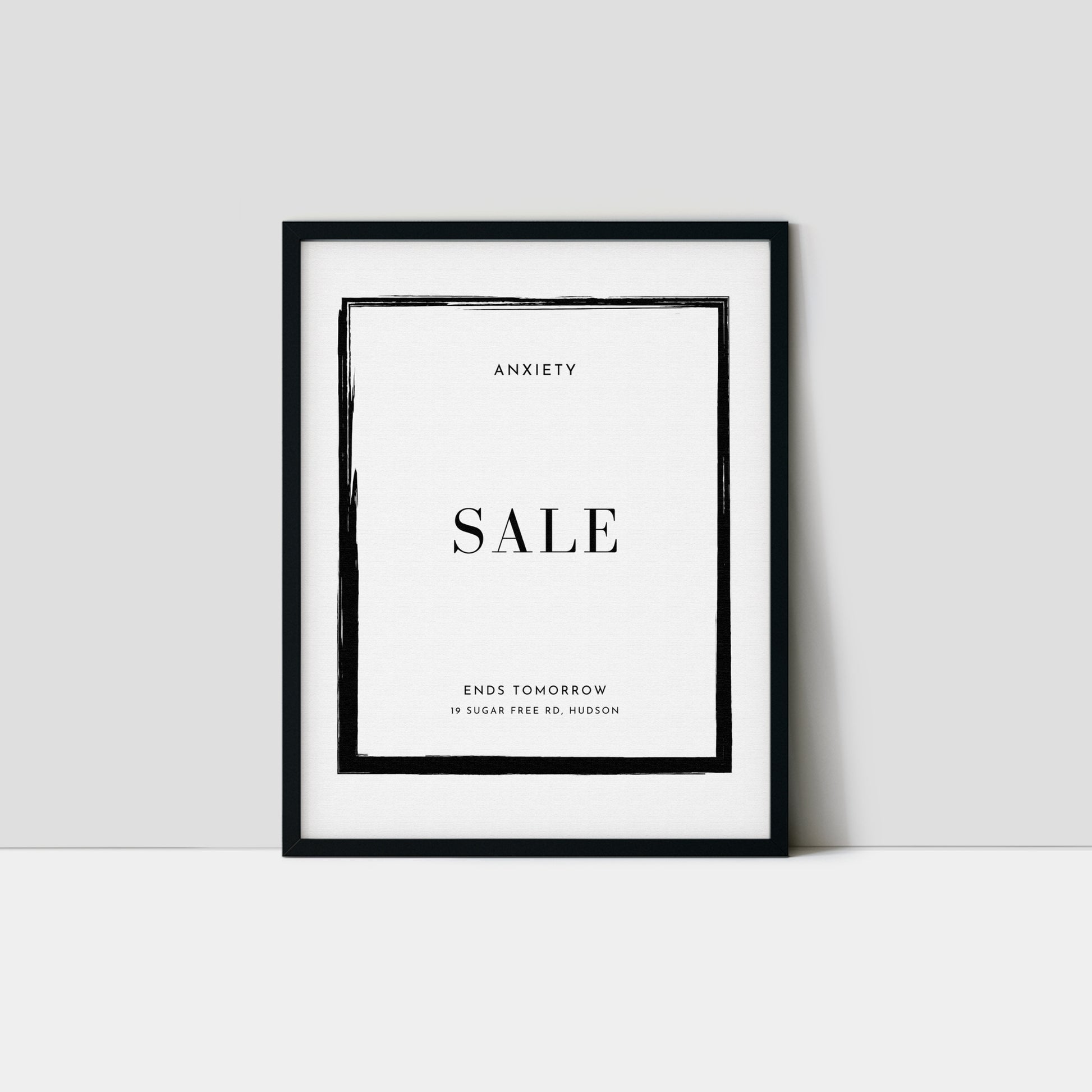 This original art print blends elegance with dark humor. Designed in a luxury sale flyer aesthetic, this satirical print merges mental health themes with retail language, confronting trauma with biting wit and stark typography. The perfect gift for your mentally exhausted bestie, your own bathroom, office, or creative space.