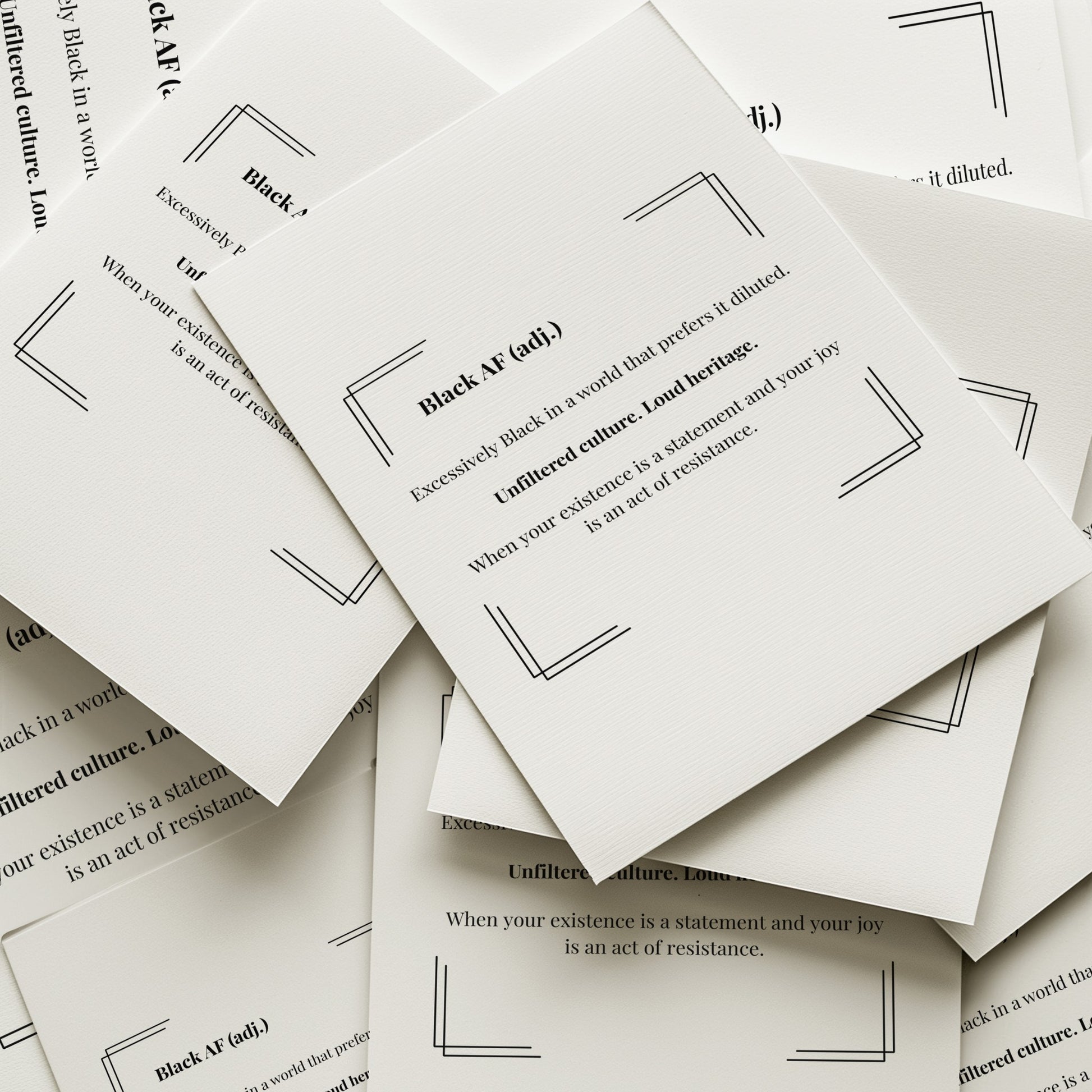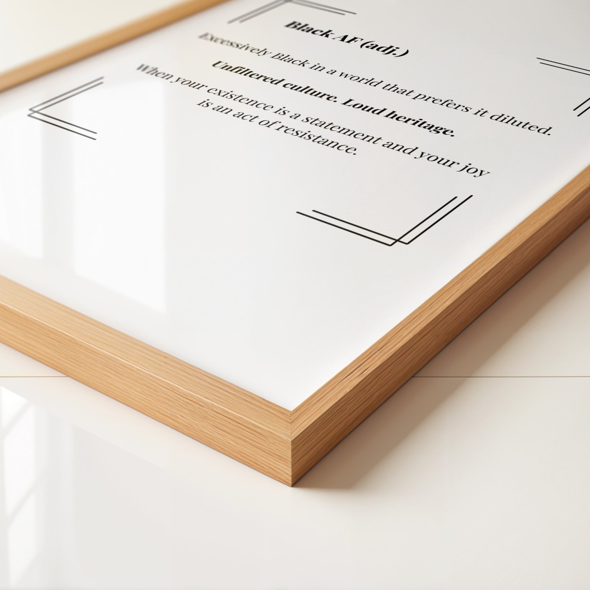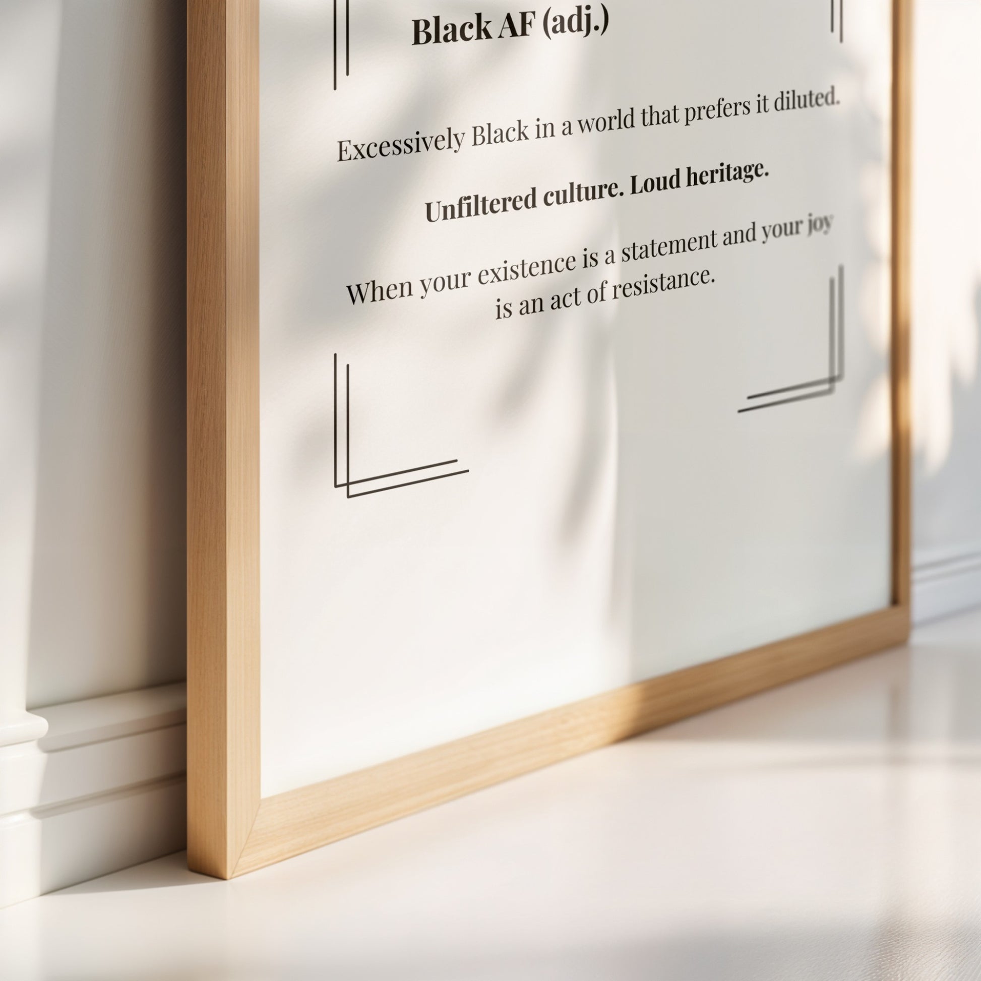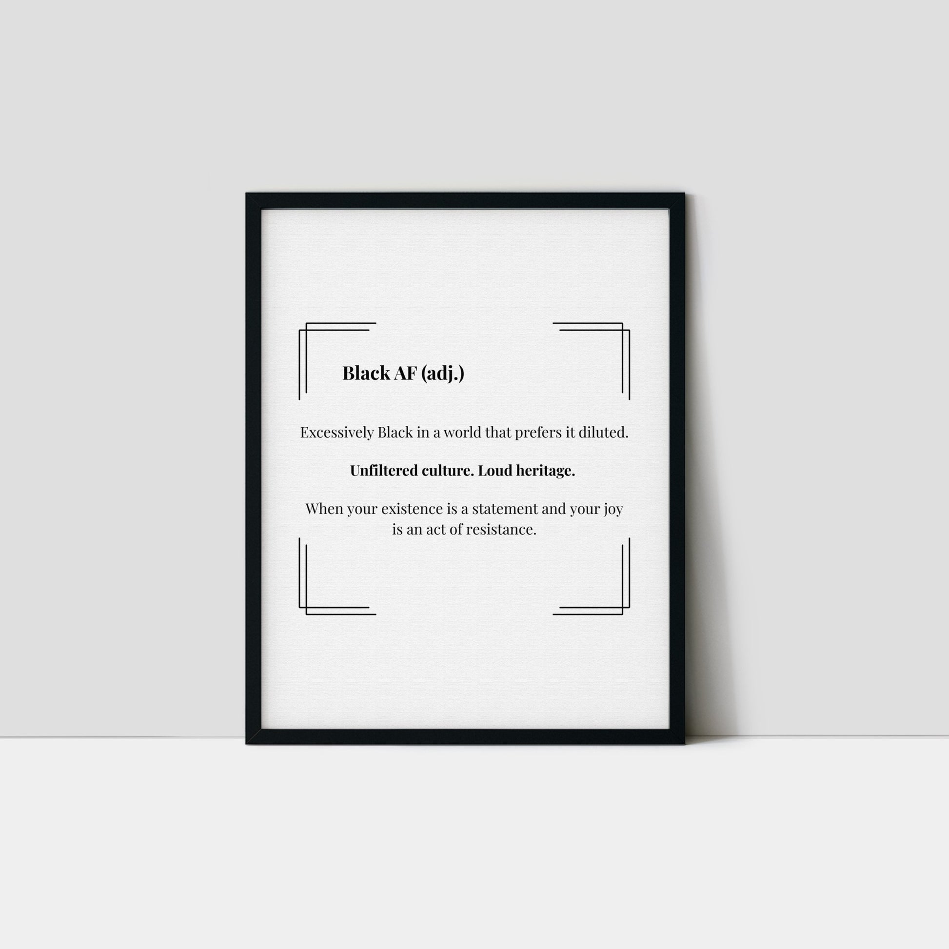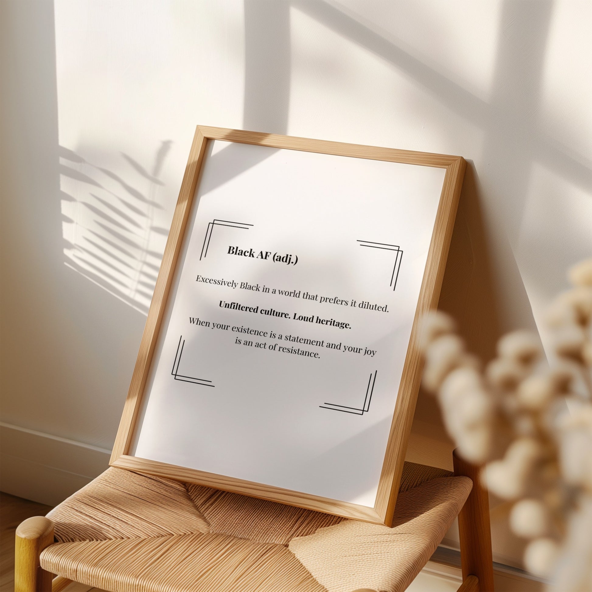 This typography print reads like a definition, but it’s really a declaration, centering Black identity without dilution, apology, or translation. The language is direct, the tone is unapologetic, and the design is intentionally minimal, allowing the message to hold the room on its own.