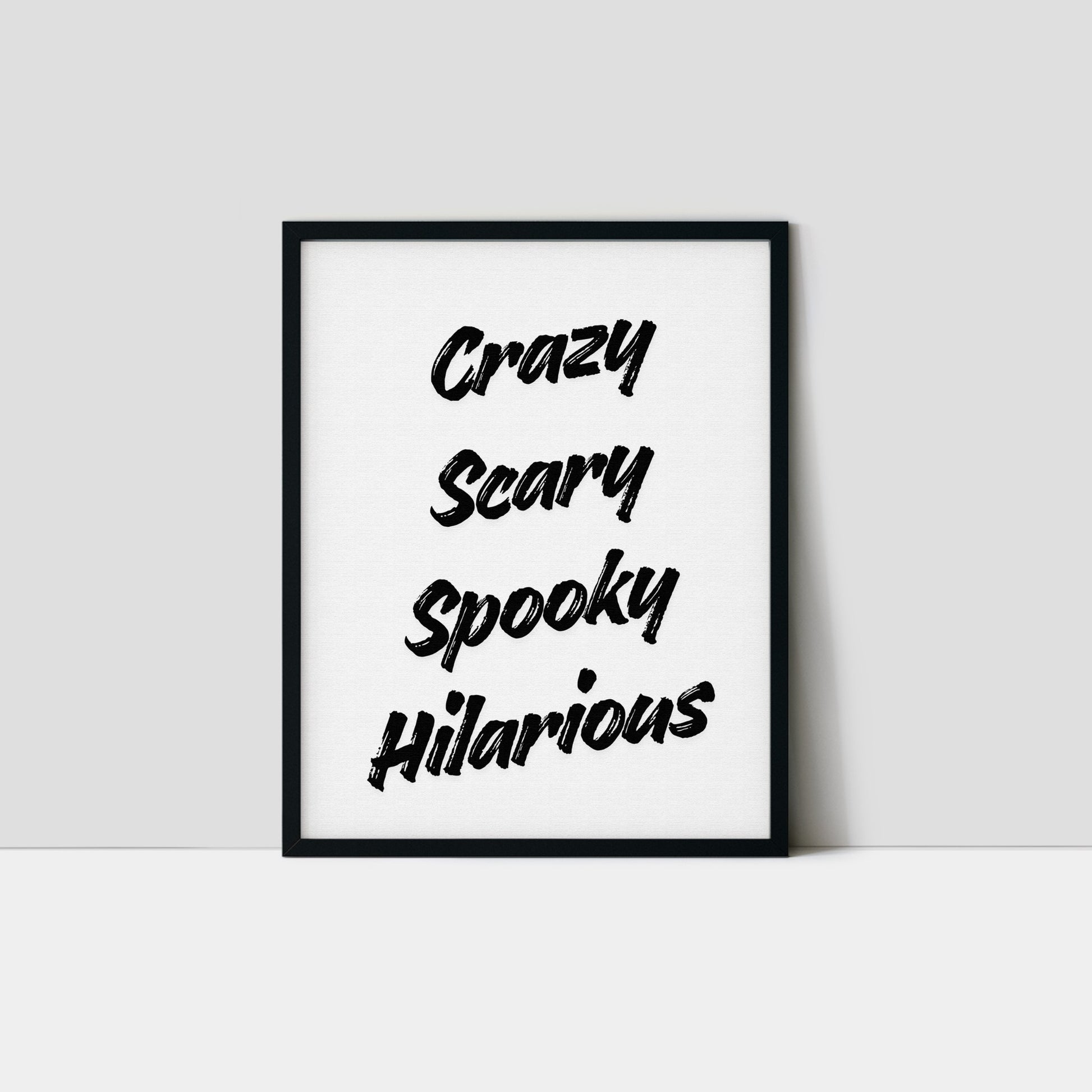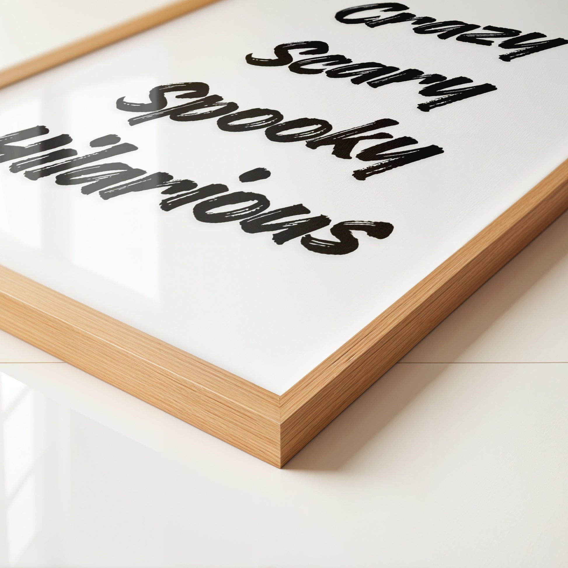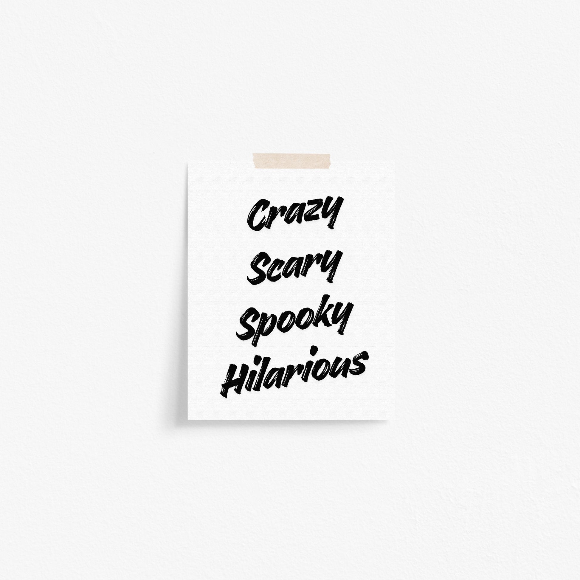 This typographic art print pulls four unforgettable words into the spotlight: Crazy, Scary, Spooky, Hilarious. Rendered in expressive, hand-painted black brush lettering, the design feels raw, rhythmic, and alive, mirroring the energy of the lyrics that inspired it.