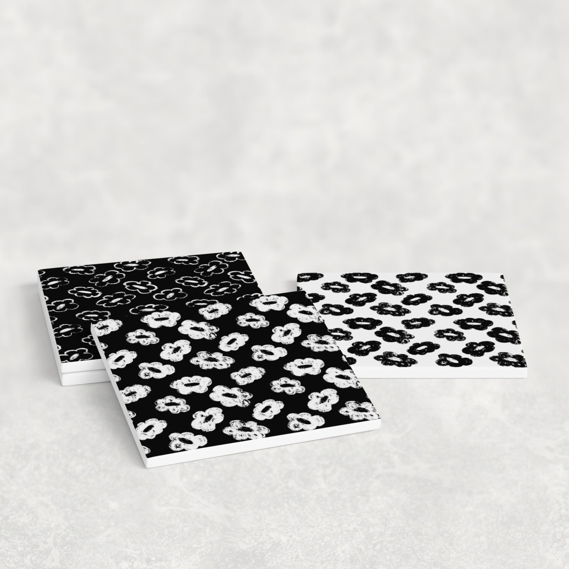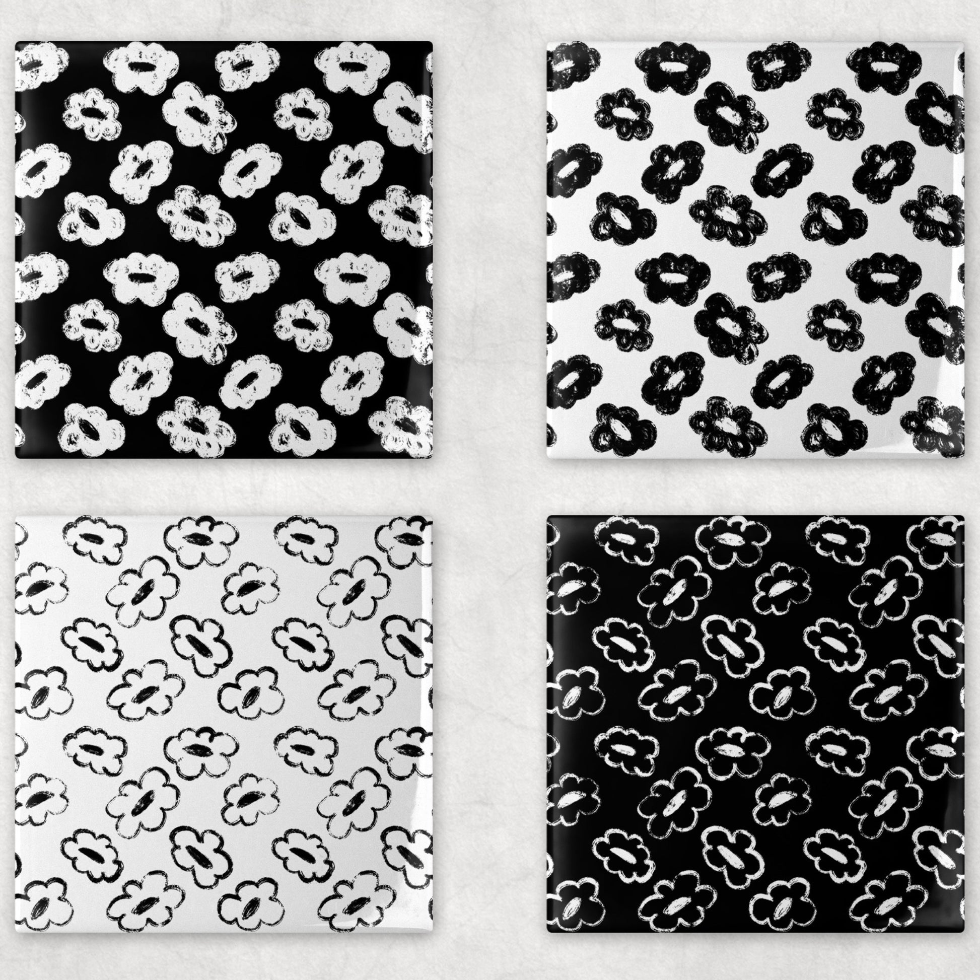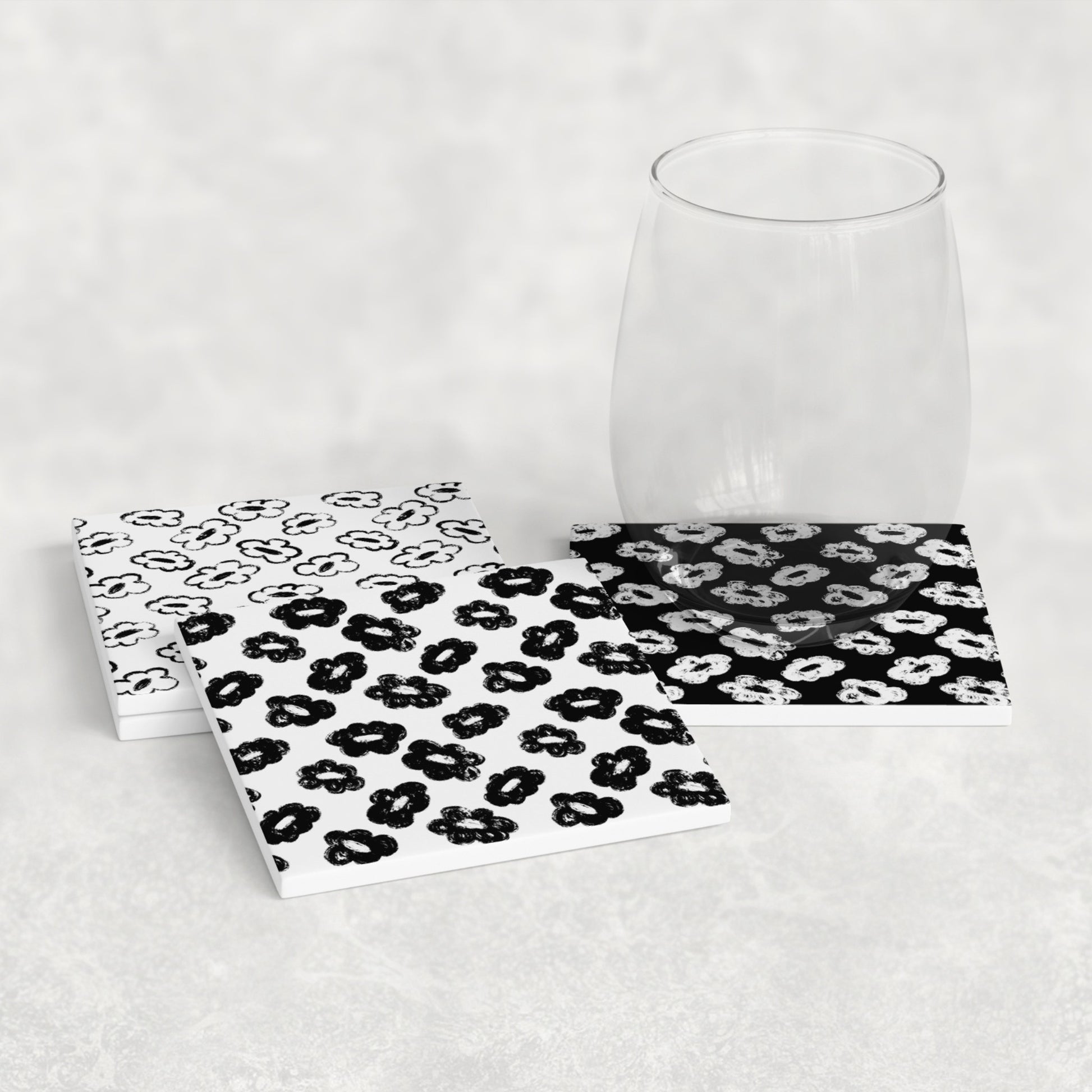 This ceramic coaster set features hand-drawn, distressed floral patterns with each flower varying slightly in petal shape and texture, giving the design an intentionally imperfect, organic feel, almost like chalk or dry brush stamps. Each coaster plays with contrast, mixing white-and-black variations to create a cohesive yet visually dynamic set. The design feels playful, graphic, and modern, perfect for spaces that lean minimal but still want personality.