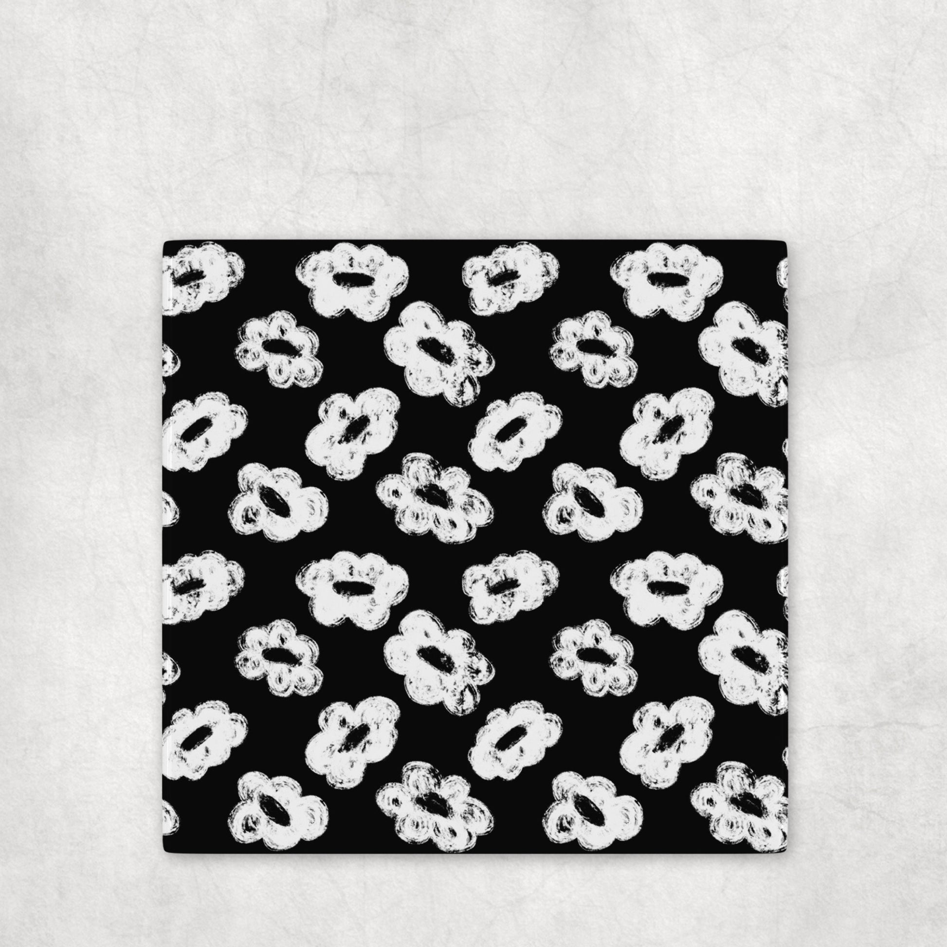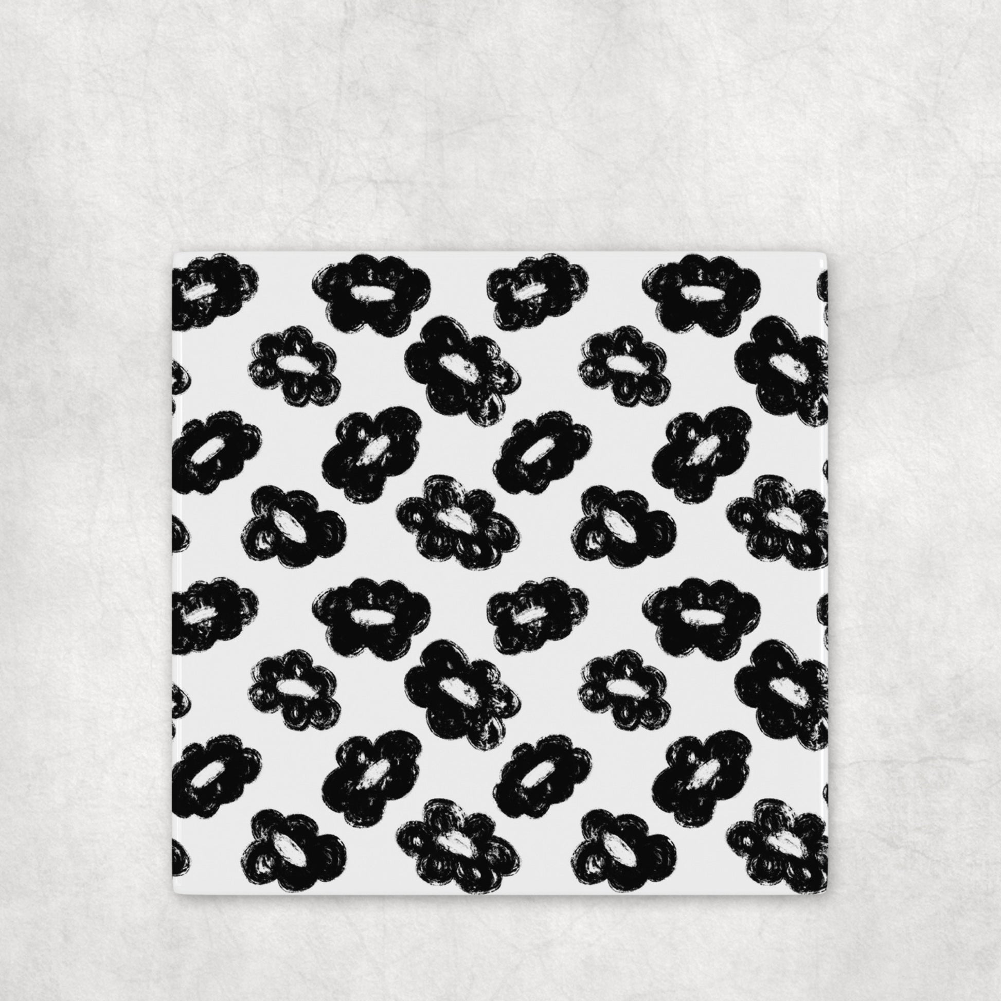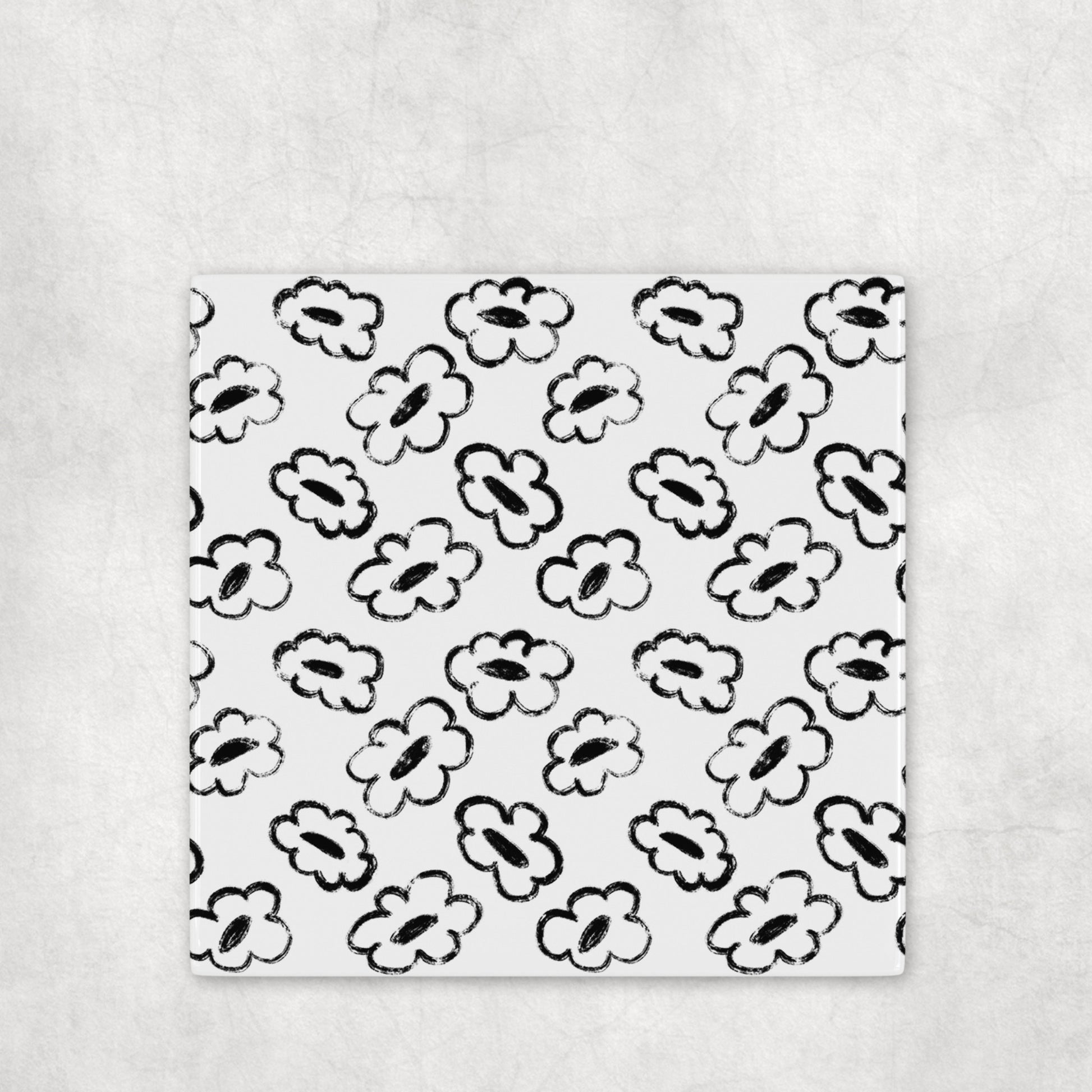 This ceramic coaster set features hand-drawn, distressed floral patterns with each flower varying slightly in petal shape and texture, giving the design an intentionally imperfect, organic feel, almost like chalk or dry brush stamps. Each coaster plays with contrast, mixing white-and-black variations to create a cohesive yet visually dynamic set. The design feels playful, graphic, and modern, perfect for spaces that lean minimal but still want personality.