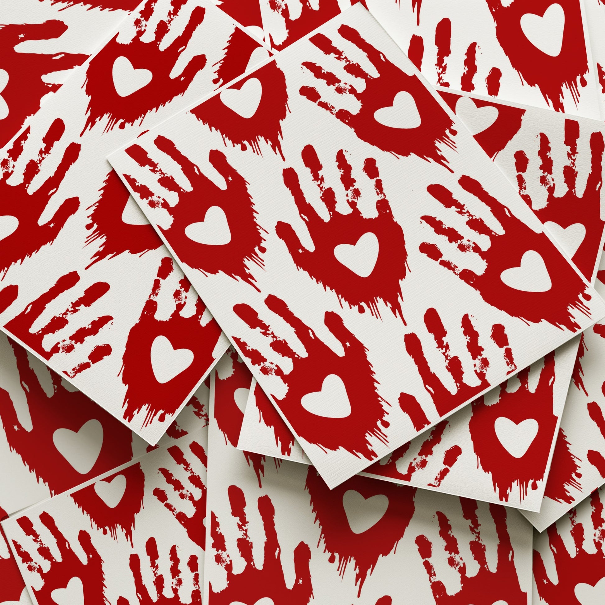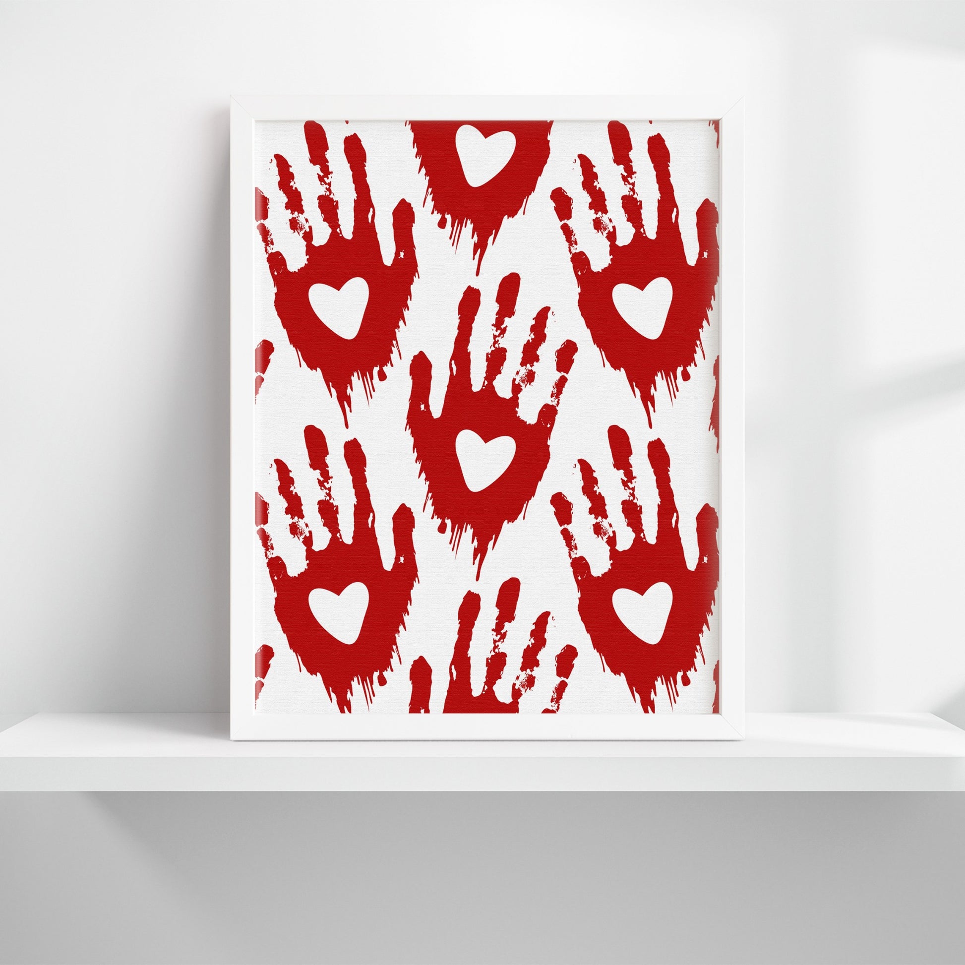 This art print blends raw emotion with graphic design in a high-impact pattern of dripping red handprints, each stamped with a white heart at its core. Symbolic, chaotic, and full of energy, it speaks to love born from struggle, rebellion, and resilience. Perfect for decorating a creative studio, a moody gallery wall, or a bold accent space.