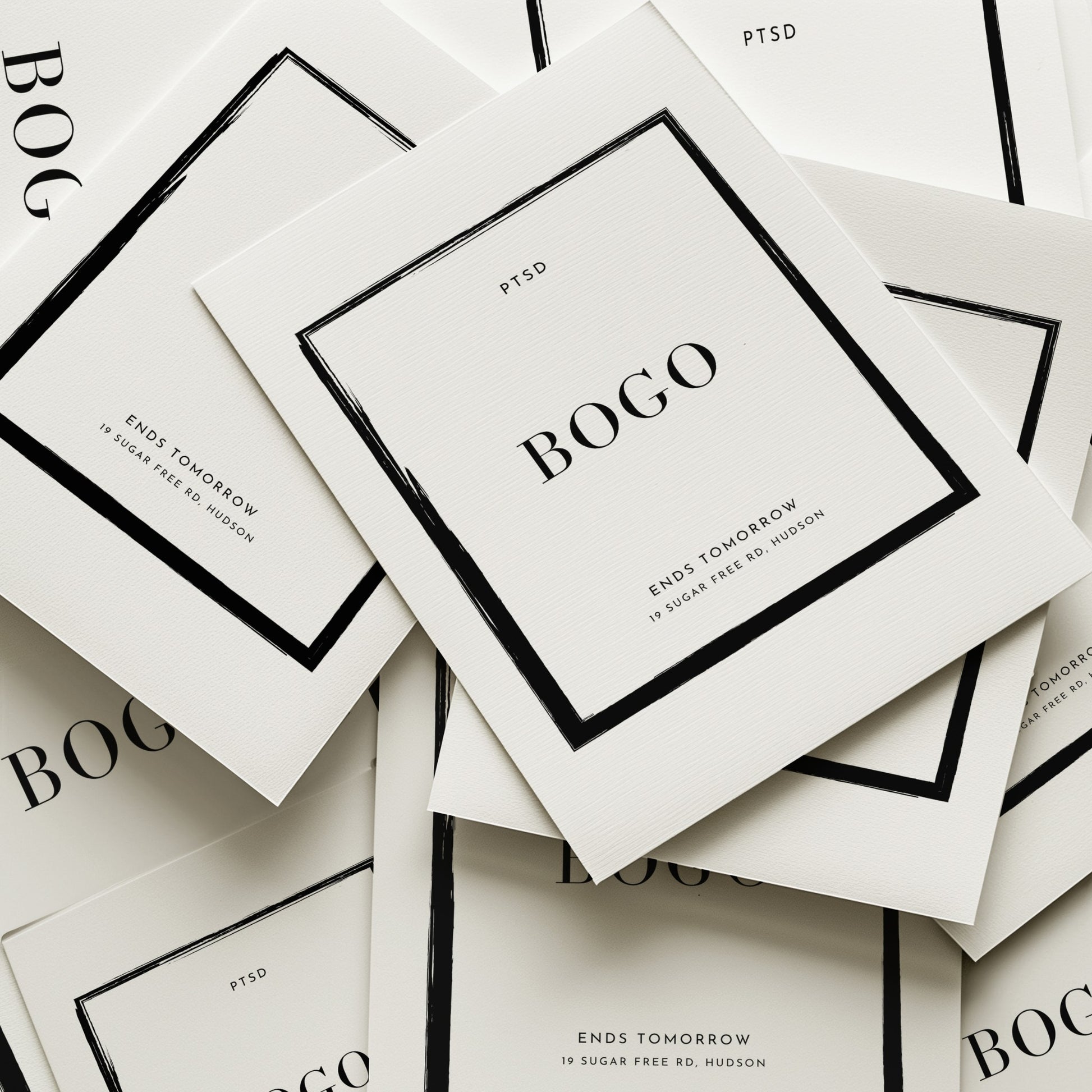 Designed in a luxury sale flyer aesthetic, this satirical print merges mental health themes with retail language, confronting trauma with biting wit and stark typography.