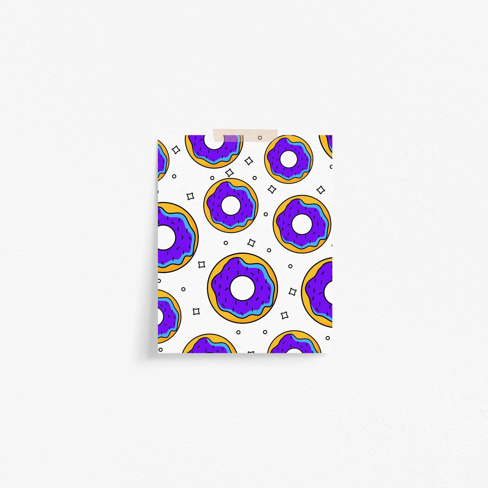 Add some sweet flavor to your space with this eye-catching donut-themed art print. Featuring a repeating pattern of purple-frosted donuts on a crisp white background, this print radiates charm and nostalgia. It's the perfect pick for kitchens, cafés, bakeries, or anyone with a sweet tooth and a love for quirky vibes. Whether you're curating a foodie gallery wall or adding flavor to your coffee nook, this print brings the fun without the calories.