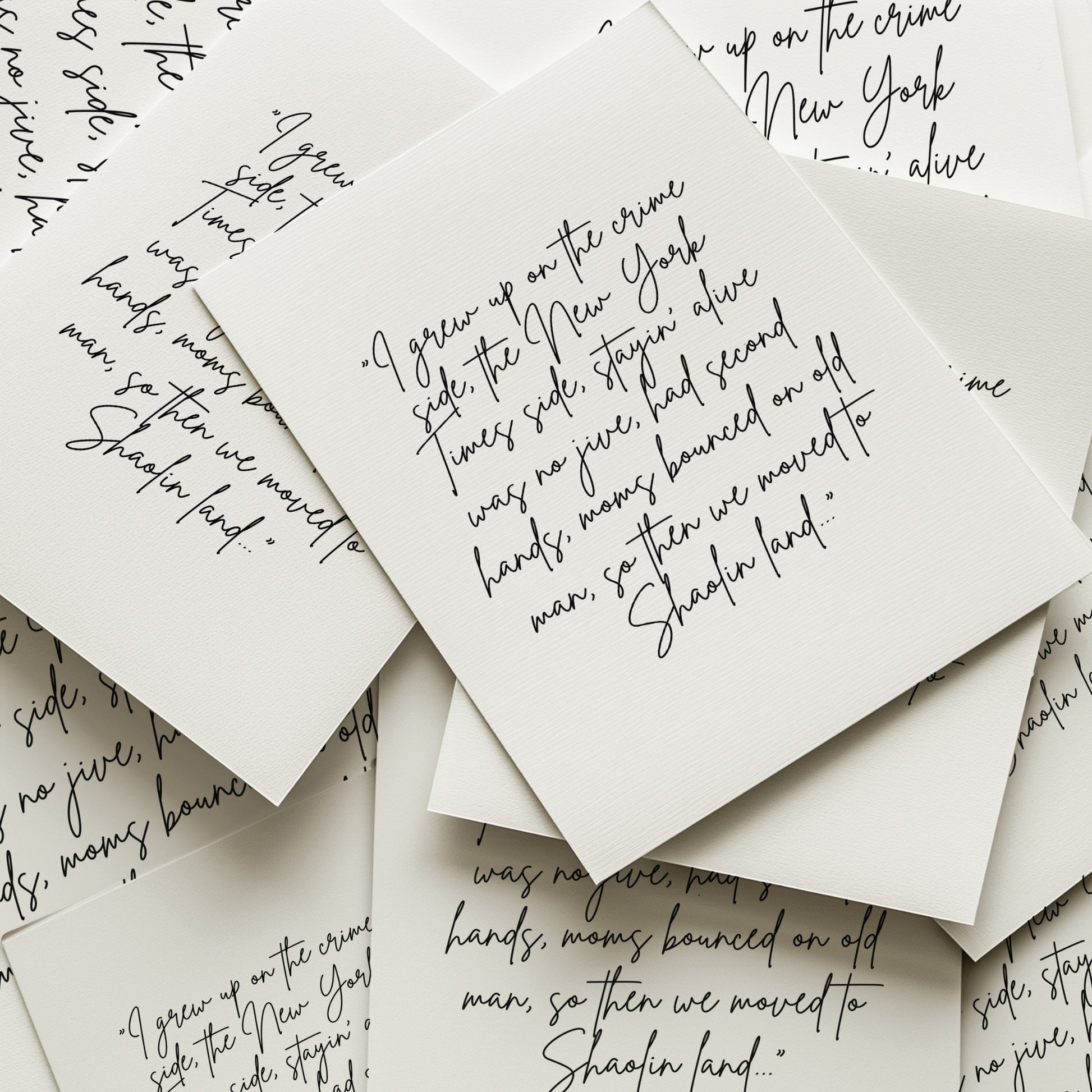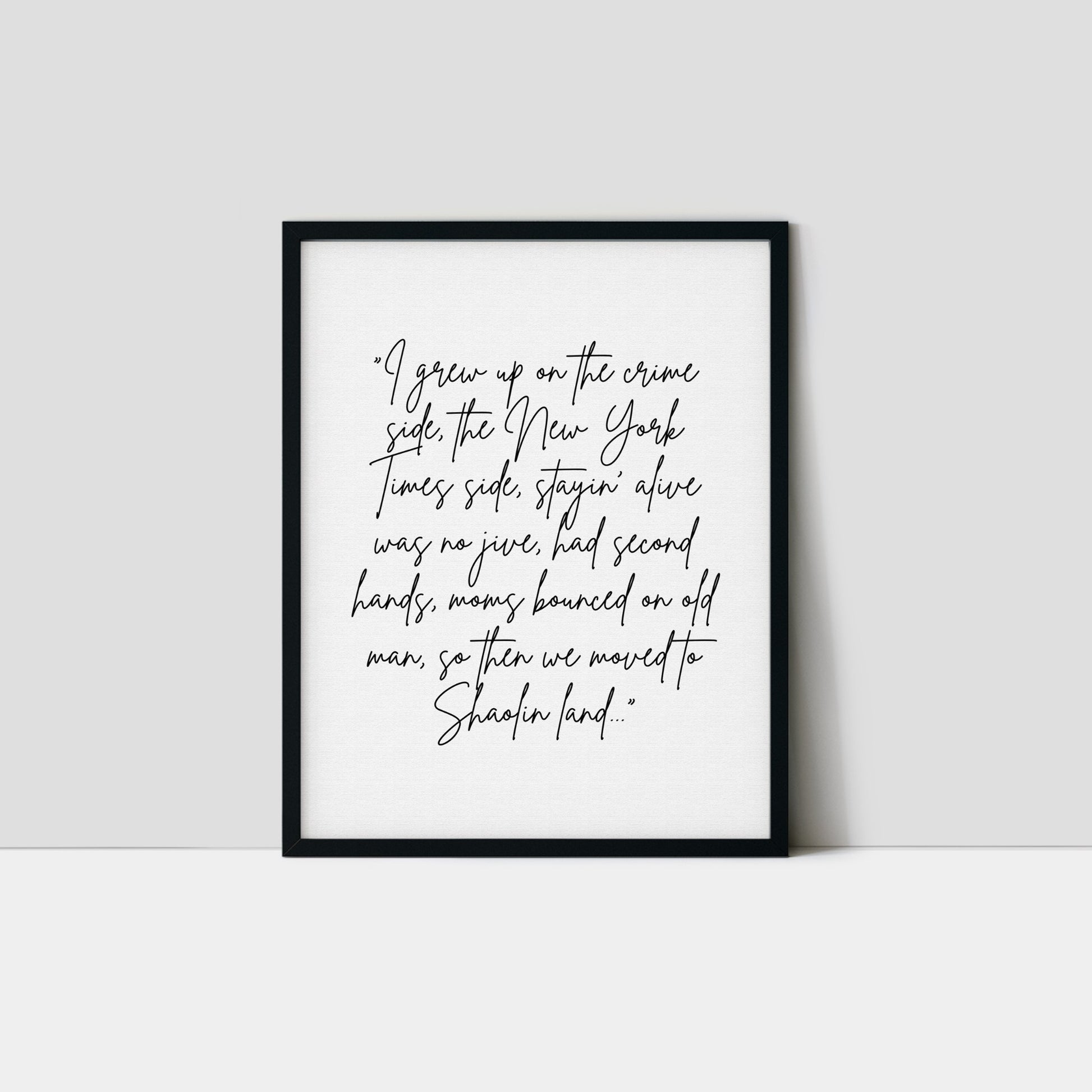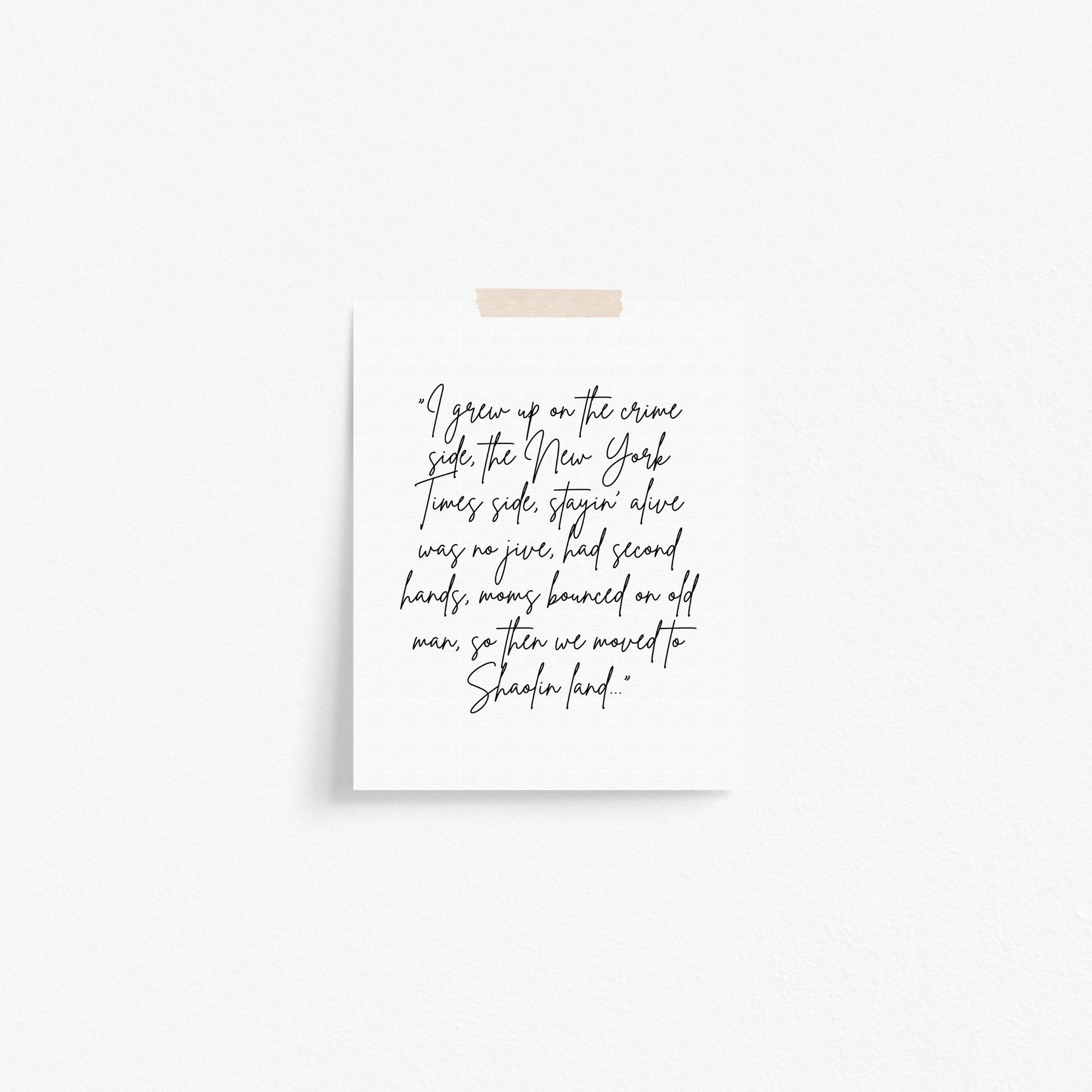 This typography print features a handwritten excerpt from a legendary verse from Raekwon, taken from the 1990s hip-hop classic C.R.E.A.M. Designed to feel personal and unfiltered, this piece reads like a memory written down rather than a quote put on display.