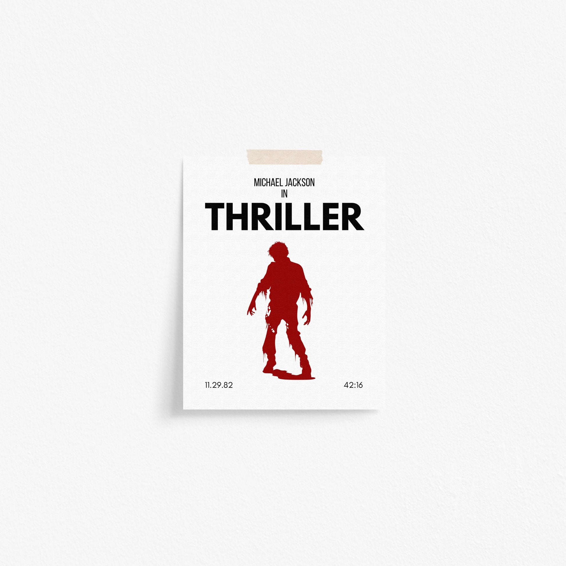Proudly display pop music history with this bold minimalist art print inspired by Michael Jackson’s iconic Thriller album. Featuring the silhouette of a zombie, this design is a sleek tribute to the 1982 masterpiece that redefined music, dance, and horror-pop culture.
