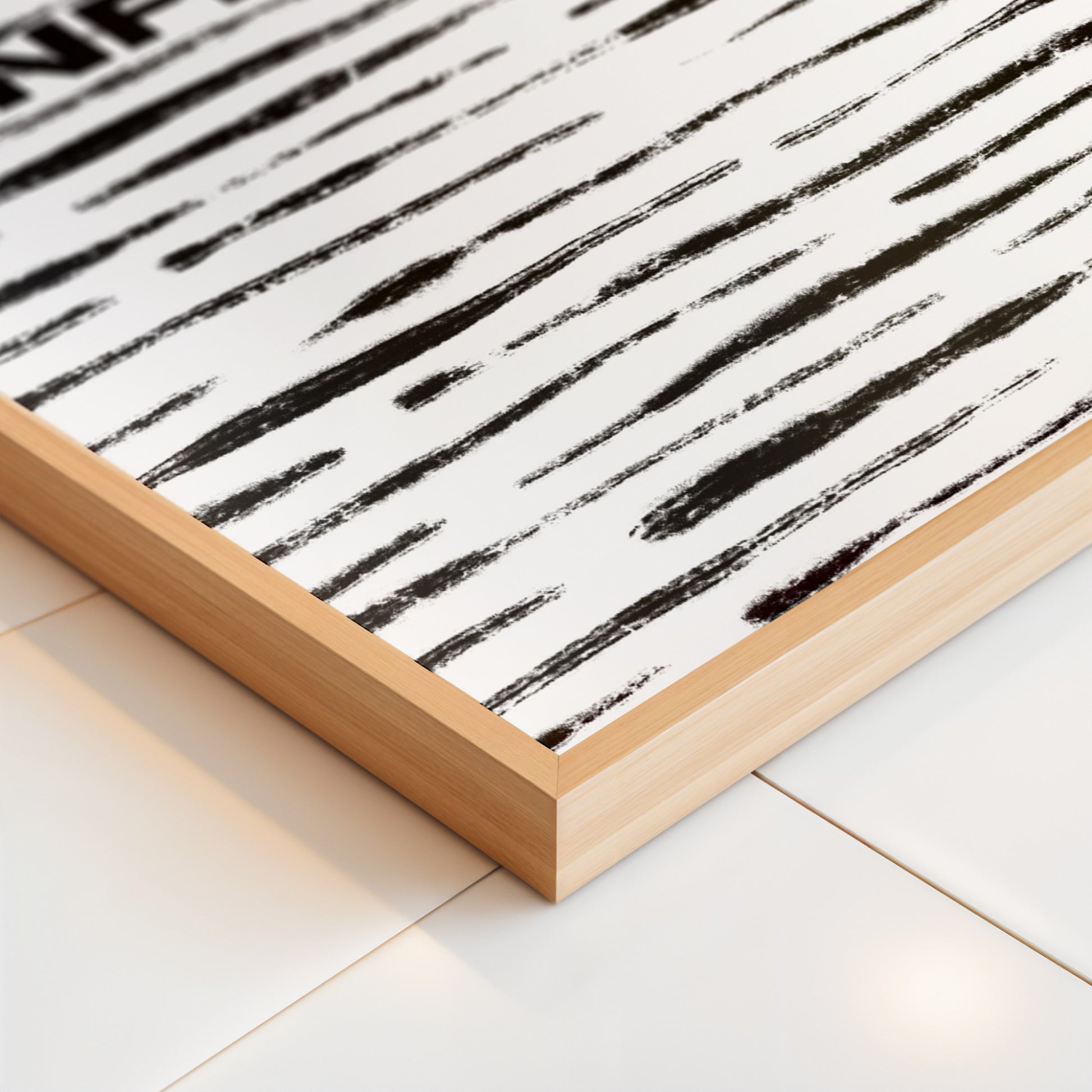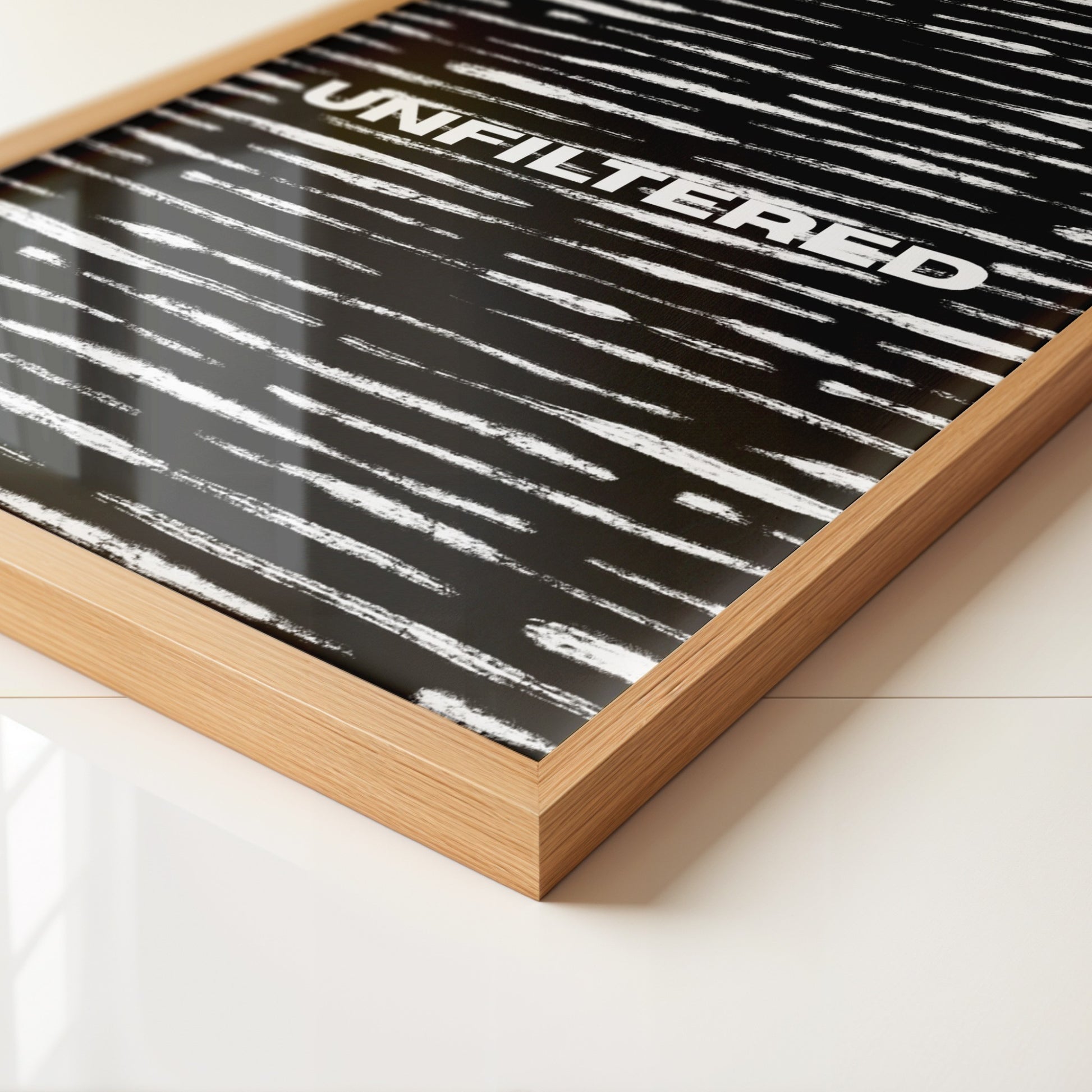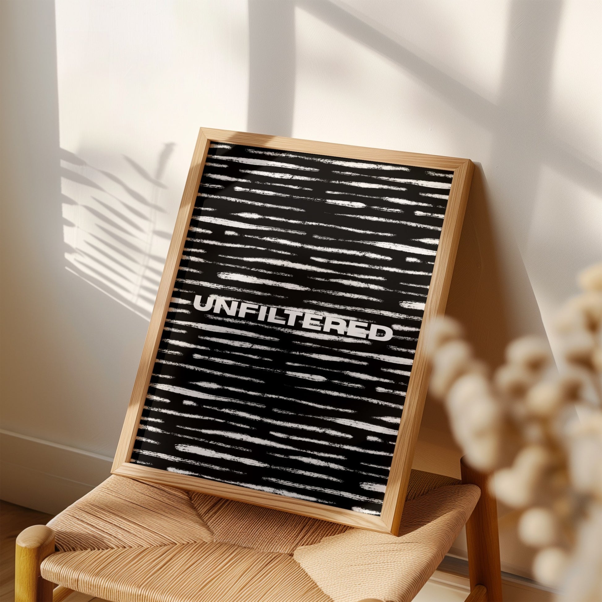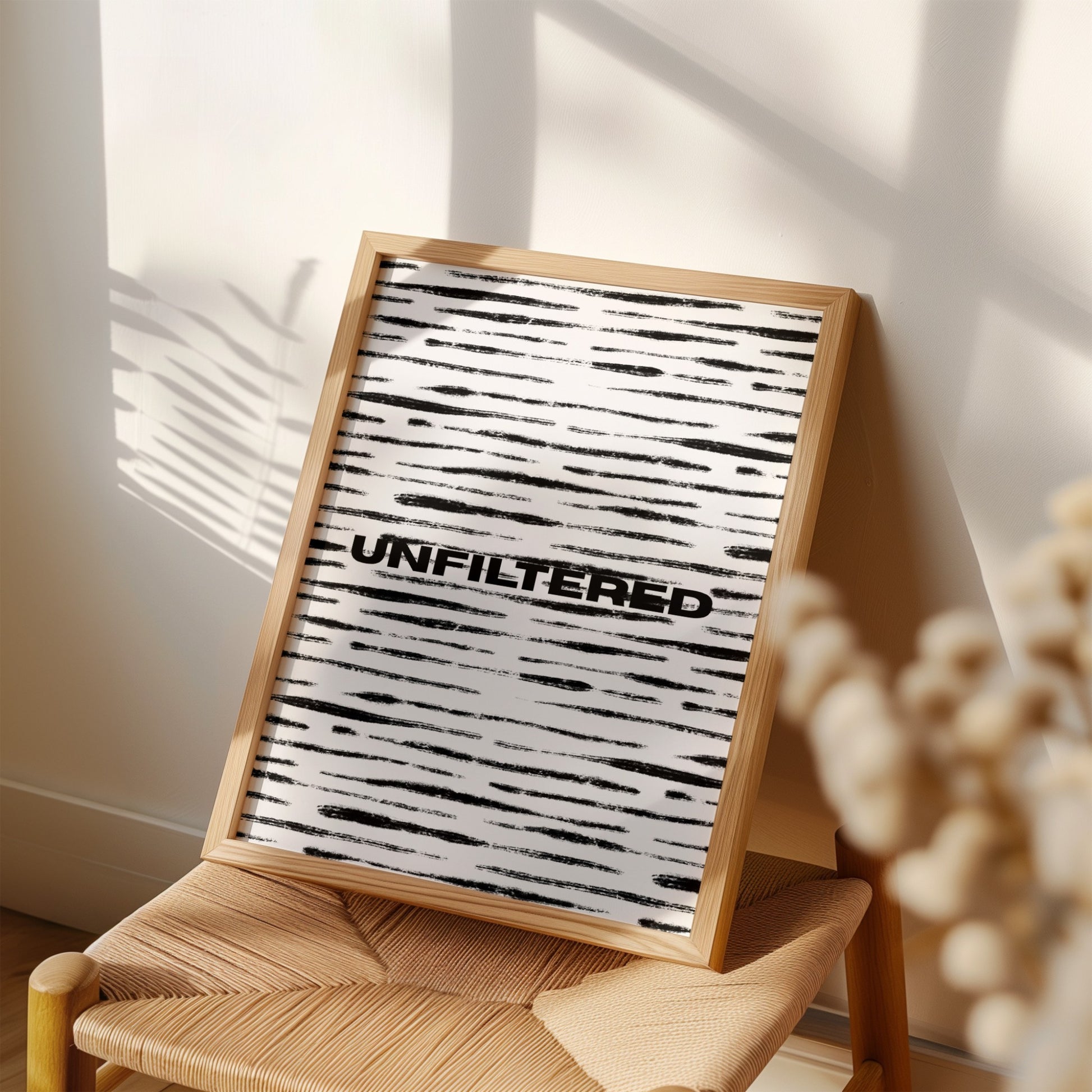 This minimalist print pairs expressive brushstroke textures with a single, unapologetic word centered in strong typography. The layered strokes add movement and imperfection, creating contrast against the background while reinforcing the message itself, nothing polished, nothing softened.